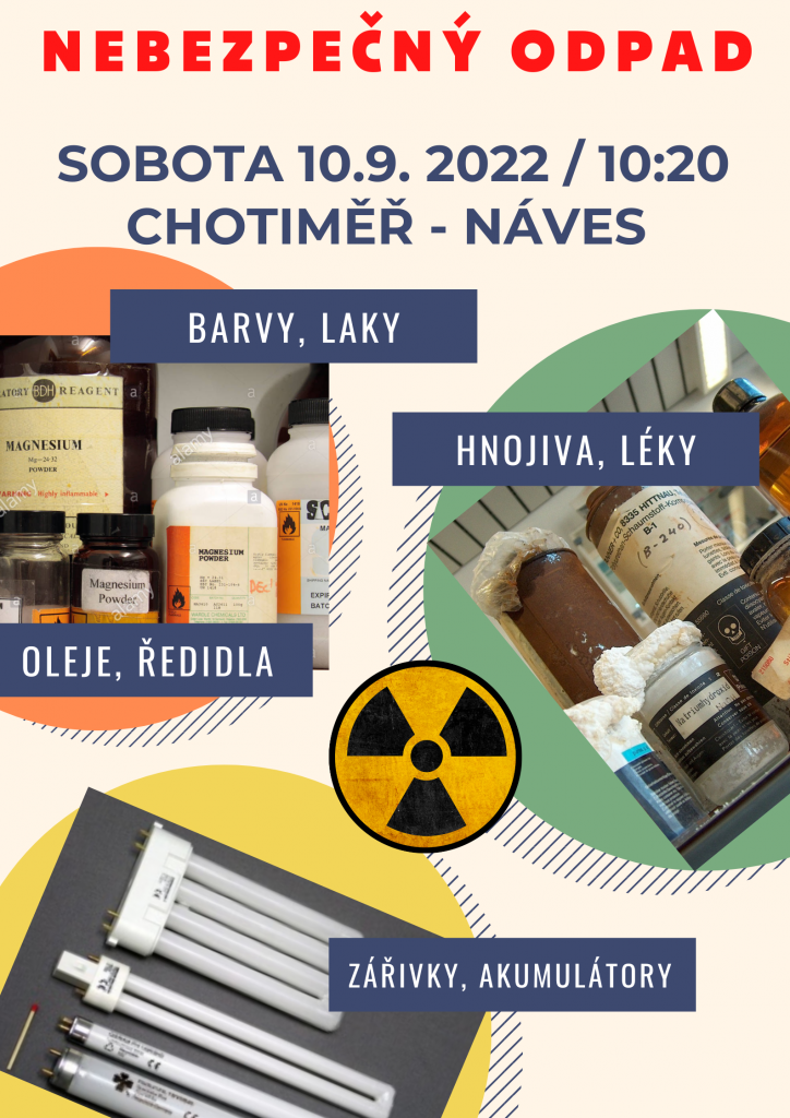 Jde o odpad, který nepatří do klasické popelnice. Nemusíte ho nikam vozit a složitě řešit, jak se ho zbavit. Stačí si vše nachystat na v sobotu 10. 9. donést v 10:20 na náves. Pokud se Vám to časově nehodí, kontaktujte obecní úřad, rádi pomůžeme.
