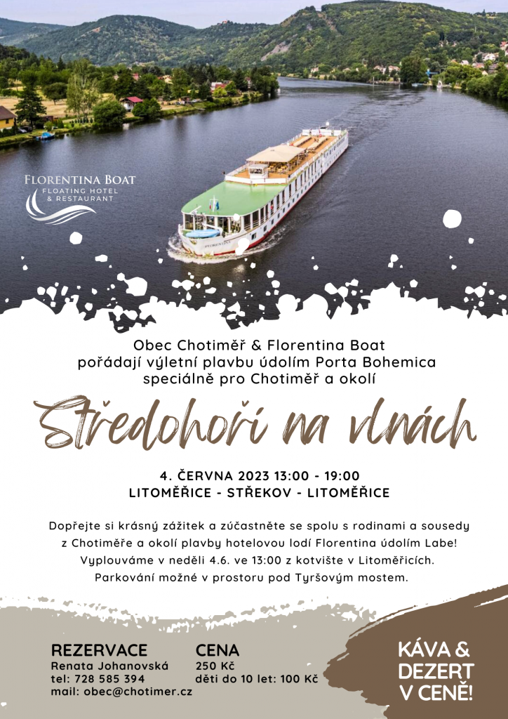 Rezervujte si místo na lodi v rámci plavby údolím Labe. Akce je určena primárně pro Chotiměř a okolí. Vezměte sebou příbuzné, sousedy či známé.