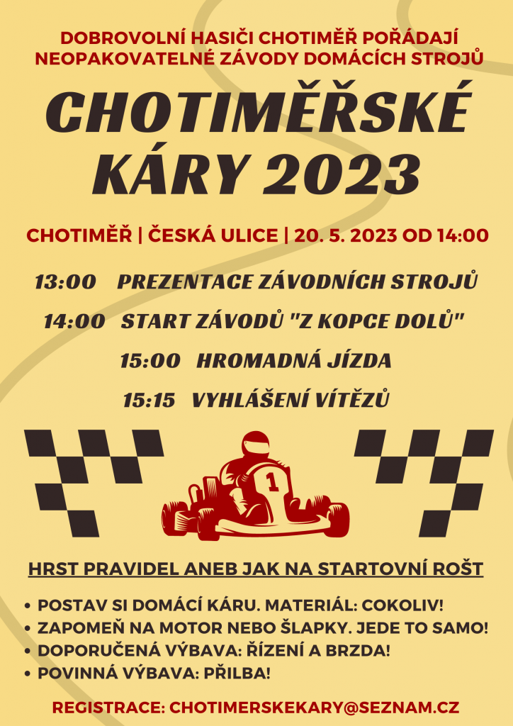Registrace závodníků předem na email chotimerskekary@seznam.cz .