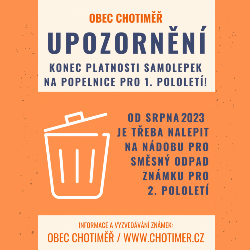 Pokud nálepku ještě nemáte, je k vyzvednutí na OÚ Chotiměř. Platby za kompletní systém nakládání s odpady pro druhou polovinu roku jsou možné v hotovosti v pokladně OÚ Chotiměř ve čtvrtek od 16:00 – 18:00 nebo převodem na účet 35927471/0100.