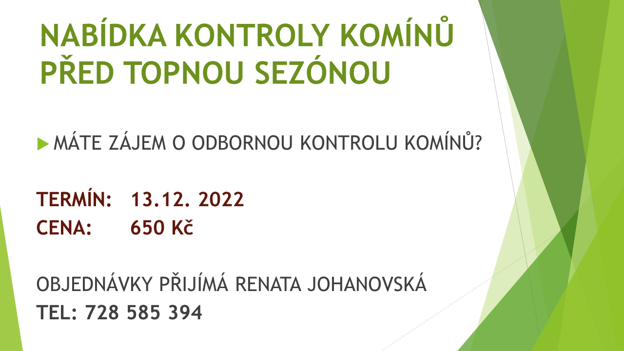 Obec Chotiměř nabízí zájemcům zprostředkování odborné kontroly komína. Cena: 650 Kč, termín: 13.12. 2022.
