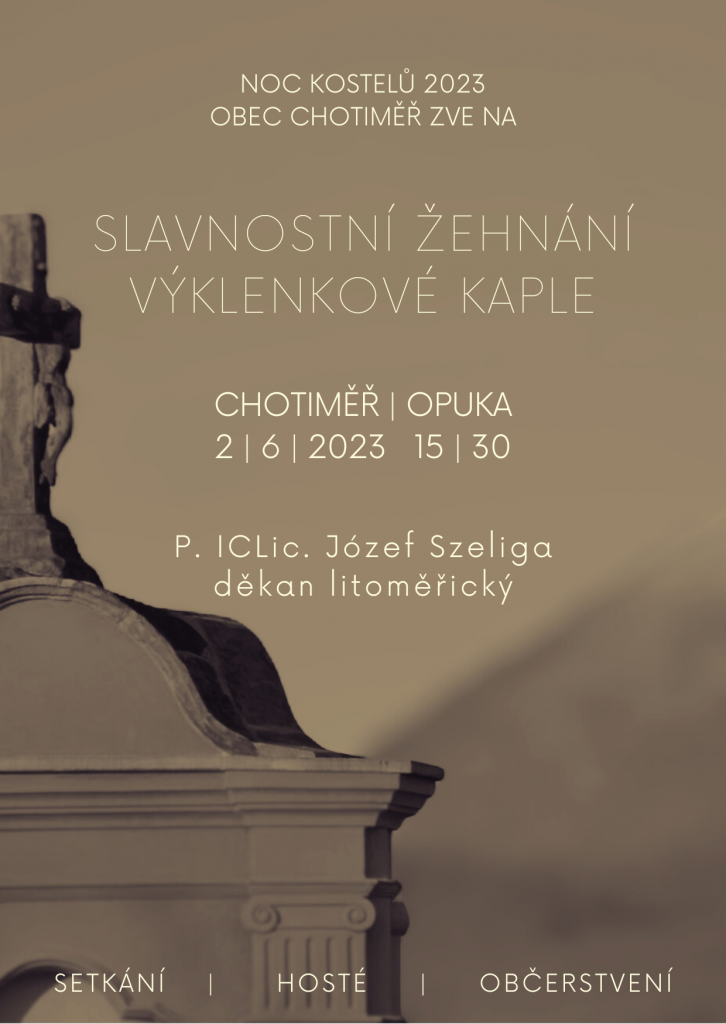 Tímto zveme také všechny sousedy a přátele obce Chotiměř. V pátek 2.6. v 15:30 proběhne přímo u kaple komorní setkání, v rámci kterého bude stavbě požehnáno. Součástí bude také přípitek a drobné občerstvení. Sraz účastníků před 15:30 přímo na místě.