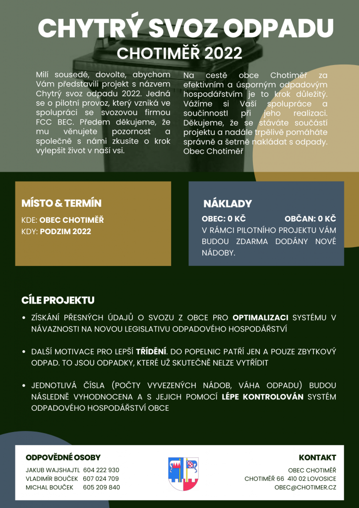 Chytrý svoz odpadu 2022 je pilotní provoz, který vzniká ve spolupráci se svozovou firmou FCC BEC. Na cestě obce Chotiměř za efektivním a úsporným odpadovým hospodářstvím je to krok důležitý.