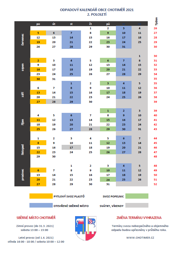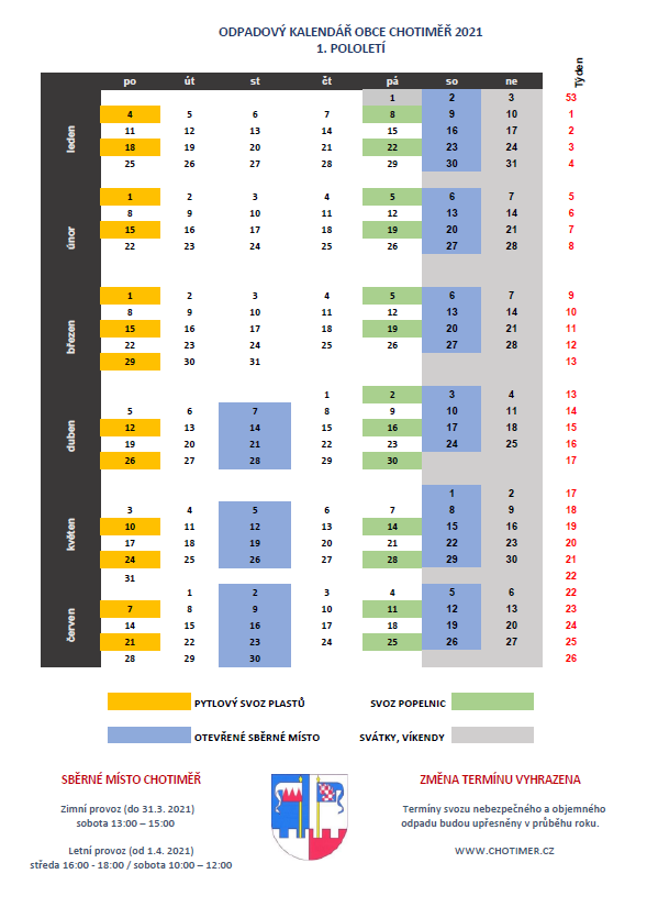 S blížícím se startem nového roku přinášíme přehledný odpadový kalendář. Naleznete v něm důležité termíny svozu plastů a směsného odpadu. Současně jsou vyznačeny dny, kdy je otevřeno sběrné místo. Případné další termíny nebo změny budou včas oznámeny informačními kanály obce. Děkujeme mnohokrát za zodpovědný přístup k nakládání s odpady, pravidelnému třídění a využívání všech možností, které v tomto směru obce nabízí.
