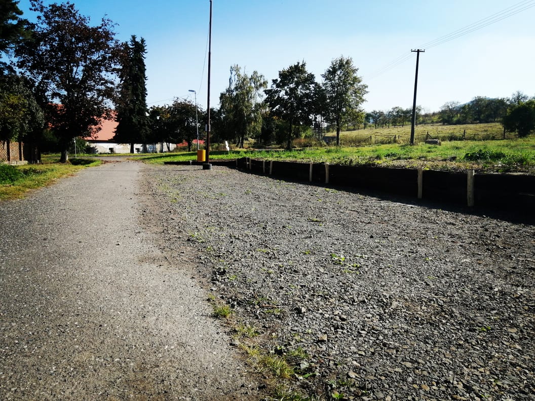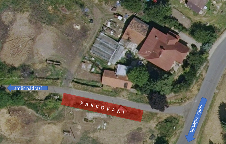 Prostor se nachází na vjezdu do obce směrem od Velemína. Jde o prostornou šotolinovou plochu podél cesty k nádraží, kam se pohodlně vejde cca 10 - 15 aut.