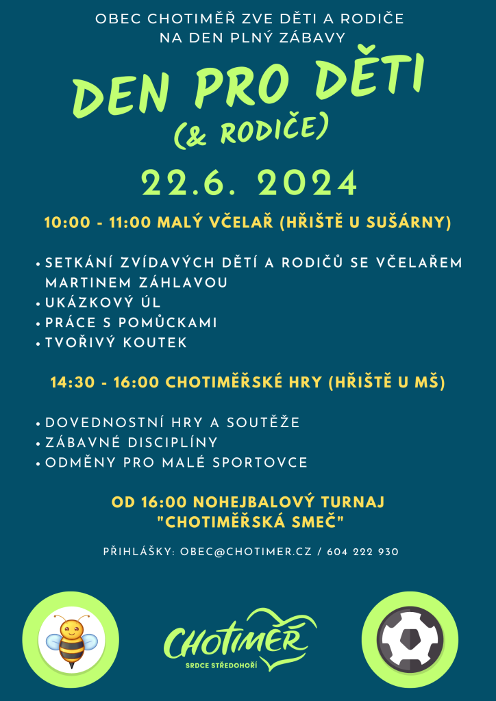 Odpoledne se pak program přenese na sportovní hřiště u MŠ, kde proběhnou tradiční Chotiměřské hry a poté další ročník nohejbalového turnaje Chotiměřská smeč.