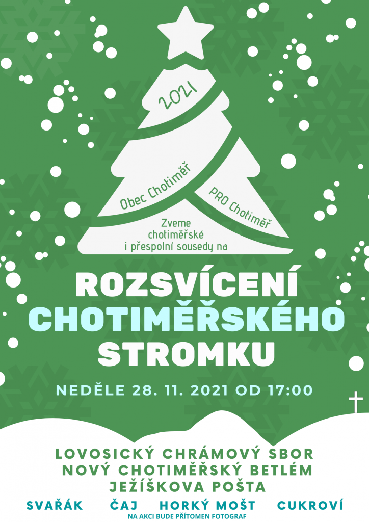 Na co se v rámci rozsvěcení stromku můžeme těšit? 28.11. v podvečer zazpívá koledy pěvecký Lovosický chrámový sbor pod vedením sbormistryně Markéty Staré a dirigenta Romana Hájka. Do chotiměřské rodiny přivítáme betlém vyřezaný v rámci nedávného Chotiměřského dřeva! A samozřejmě nebude chybět vynikající svařák, horký mošt a domácí cukroví.