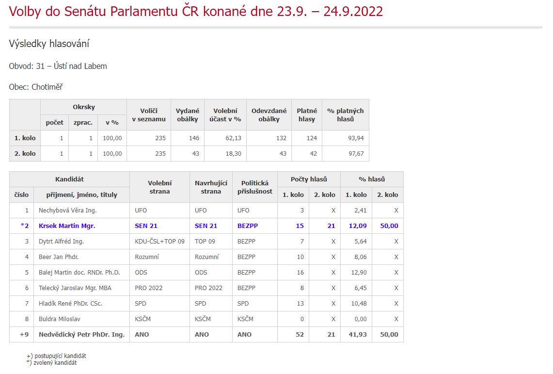 Hlasování v Chotiměři skončilo zajímavým výsledkem: každý z obou kandidátů, kteří postoupili do 2. kola v Ústeckém obvodu, získal v naší vesnici 21 hlasů, tedy přesně 50 %. Po celkovém součtu všech hlasů z našeho obvodu pak nakonec do Senátu míří Mgr. Martin Krsek (SEN 21).
