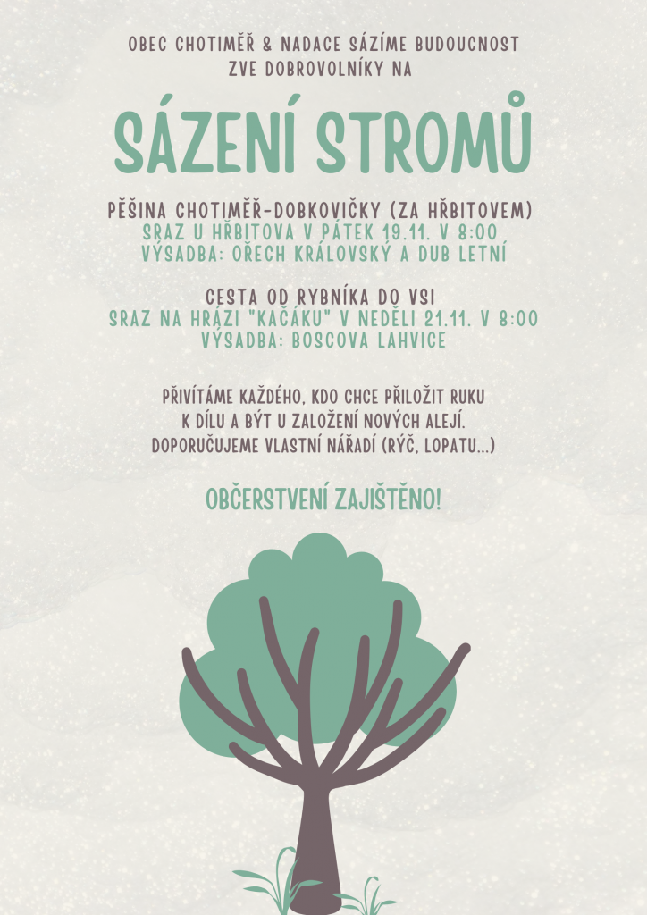 Tento týden v pátek a v neděli proběhne osazení chystané obnovené pěšiny za hřbitovem spojující Chotiměř a Dobkovičky (pátek) a zrekonstruované cesty podél rybníka Kačák (neděle). Výsadbu provádí obec Chotiměř za podpory nadace Sázíme budoucnost a je 100% financována z dotačních programů SFŽP. Pokud můžete vzít vlastní nářadí (rýč, lopata, hrábě...), bude to fajn.