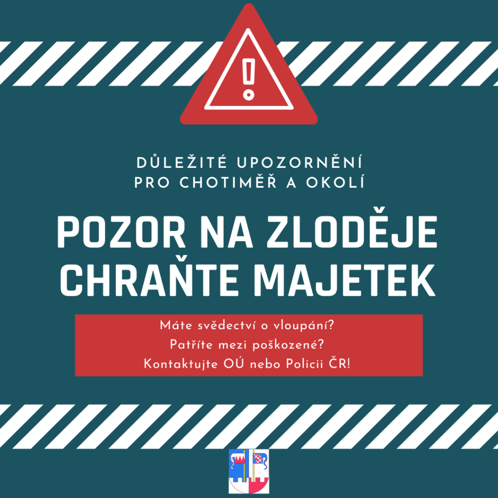 Obec již oslovila Policii ČR s prosbou o užší spolupráci a pravidelný monitoring chotiměřských ulic především v nočních hodinách. Současně také prosíme vás, obyvatele obce, o kontrolu zajištění majetku, především zahradních domků, garáží, sklepů, chlévů atd. Cizí osoby byly spatřeny v noci ze soboty na neděli v části obce kolem návsi, není ovšem vyloučeno, že se pohybovaly i na jiných místech.